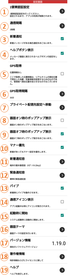 アプリ起動中に常に表示されるアイコンの設定です。② 緊急通知