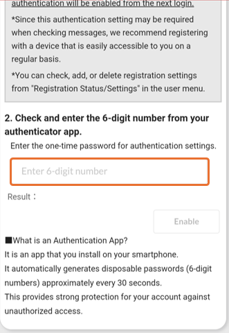 * An authentication app is an application installed on your smartphone. It automatically generates a disposable password (6 digits) approximately every 30 seconds. This provides strong protection for your account against unauthorized access.