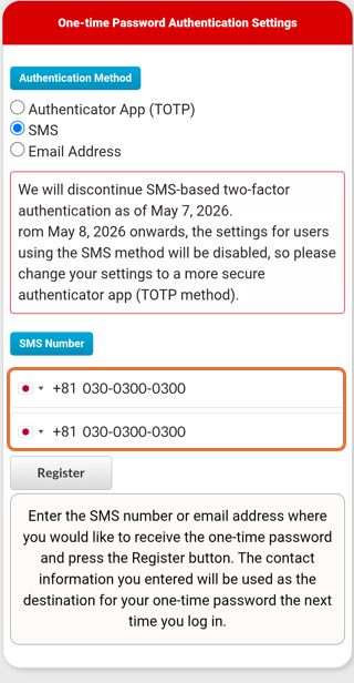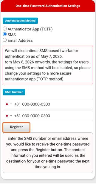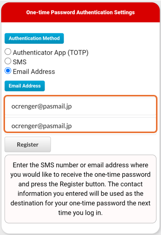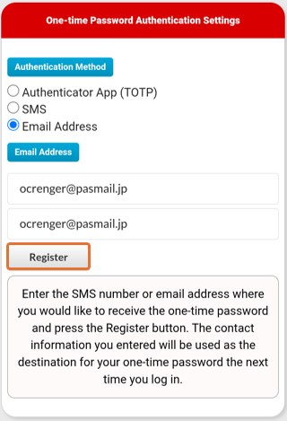 Settings can also be registered or deleted from the one-time password authentication method in the Registration Status/Settings screen.