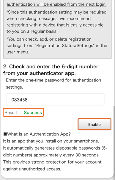 ➆ When authentication succeeds, 'Success' will be displayed in the result field and the 'Enable' button will become active.Press this button.