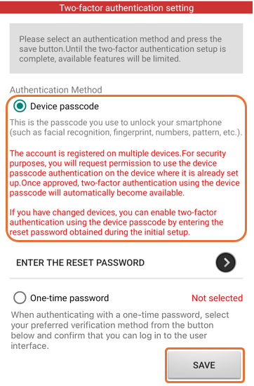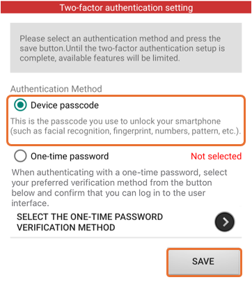 When the two-factor authentication setup screen appears, please select your Device passcode and press the "SAVE" button.