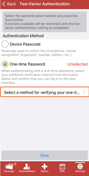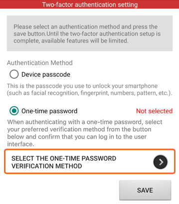 The Two-factor authentication settings screen will appear, so please press to SELECT THE ONE-TIME PASSWORD VERTIFICATION METHOD.